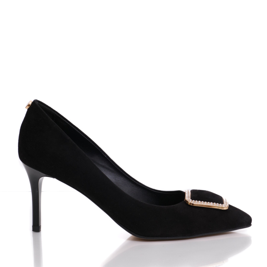 Pantof de culoare neagra, realizat din piele intoarsa.