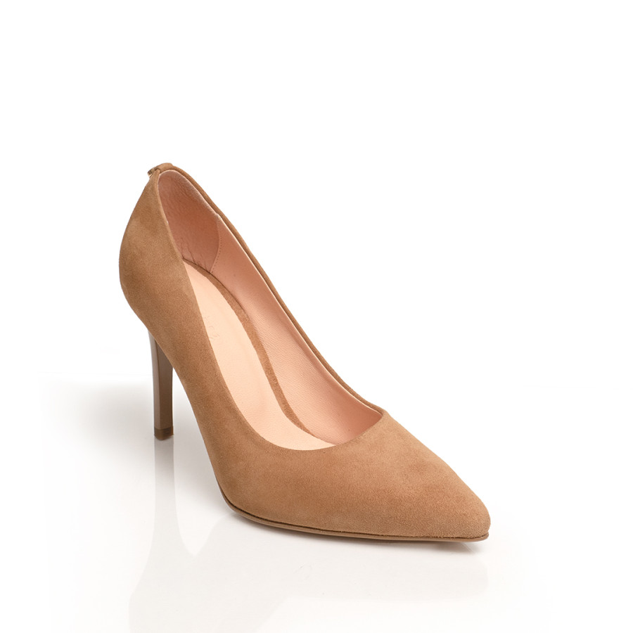 Pantof realizat din piele intoarsa de culoare maro deschis.